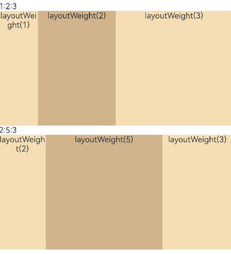 @Entry @Component struct layoutWeightExample { build() { Column() { Text('1:2:3').width('100%') Row() { Column() { Text('layoutWeight(1)') .textAlign(TextAlign.Center) }.layoutWeight(1).backgroundColor(0xF5DEB3).height('100%') Column() { Text('layoutWeight(2)') .textAlign(TextAlign.Center) }.layoutWeight(2).backgroundColor(0xD2B48C).height('100%') Column() { Text('layoutWeight(3)') .textAlign(TextAlign.Center) }.layoutWeight(3).backgroundColor(0xF5DEB3).height('100%') }.backgroundColor(0xffd306).height('30%') Text('2:5:3').width('100%') Row() { Column() { Text('layoutWeight(2)') .textAlign(TextAlign.Center) }.layoutWeight(2).backgroundColor(0xF5DEB3).height('100%') Column() { Text('layoutWeight(5)') .textAlign(TextAlign.Center) }.layoutWeight(5).backgroundColor(0xD2B48C).height('100%') Column() { Text('layoutWeight(3)') .textAlign(TextAlign.Center) }.layoutWeight(3).backgroundColor(0xF5DEB3).height('100%') }.backgroundColor(0xffd306).height('30%') } } }图11 横屏
